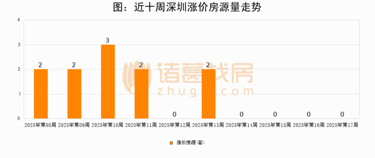从调价房源来看,第17周深圳涨价房源0套,较上周持平。与此同时,17周涨价房源占比提升100个百分点,业主信心持续恢复。