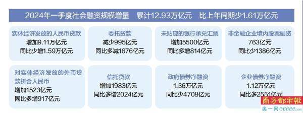 贷款方面,央行数据显示,初步统计,2024年一季度社会融资规模增量累计为12.93万亿元,比上年同期少1.61万亿元。其中,对实体经济发放的人民币贷款增加9.11万亿元,同比少增1.59万亿元。