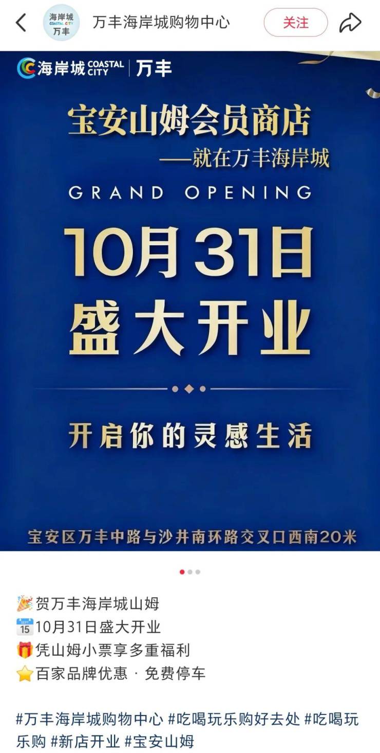 10月31日!宝安山姆会员店开业时间定了