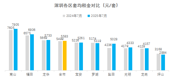 据深圳贝壳研究院监测,今年7月深圳商品房套均租金为5583元/套,同比上涨1.5%。主要是近期换租需求有所增多,带动高价物业成交占比上升,这类需求多来自家庭租房群体,他们更注重房屋的居住品质,而且对租金的承受能力更强。
