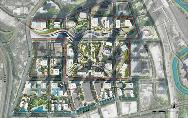 沿高铁站东西向布局科技展览馆、交互式试验商业等场所,构建“产-城-站融合综合开发带”;东侧地铁上盖打造成为集甲级写字楼、先进购物中心、五星级酒店及先进公寓于一体的综合活力街道;西侧为多元文化轴,为市民提供丰富的休闲功能;同时利用现有河道景观,结合曲线动线造就的城市绿谷,串联起各个方位的绿色景观节点,形成城市轨道绿轴公园。