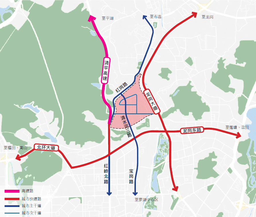 清水河三面环山,过去曾是深圳二线关的重要关口,也因此造就了其与市区割裂的孤岛现状。片区周边人工智能产业板块丰富,有着成熟的生活配套设施与产业发展,同时1条高铁线、1条城际线、4条城市轨道及多种地面交通在此交汇,交通优势使其成为了罗湖向北发展、深圳城市东拓的核心支点。