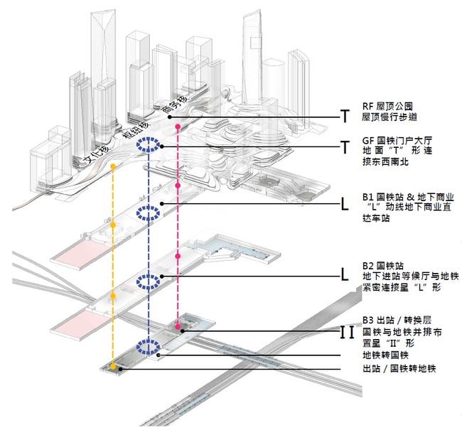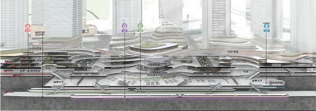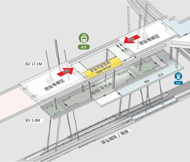 而地下四层的高铁与城际交通,以软隔断分离管理代替站台屏障,既可实现站台的互通,也为未来城际与高铁票制统一预留出了弹性发展可能。 此外,团队与上盖地块业主充分沟通协调,同步考量未来上盖开发,为其预留结构发展可能。