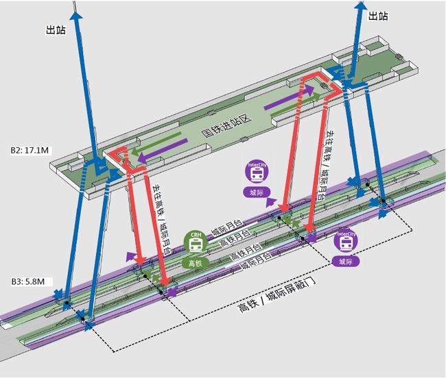 高铁与地铁间的人流转换是枢纽最主要的一支人流,设计将转换层设置在地下三层,紧挨位于地下四层的高铁及城际月台,以紧密的同层连接降低换乘时间,同时合理规划路线,减少换乘距离,地下三层至多步行50米即可完成换乘流线。其中,设计通过软隔断与扶梯位置的设置,分离了国铁换乘地铁25号线与14、17号线的流线,确保了城市轨道间换乘与国铁疏站效率的双重保障。