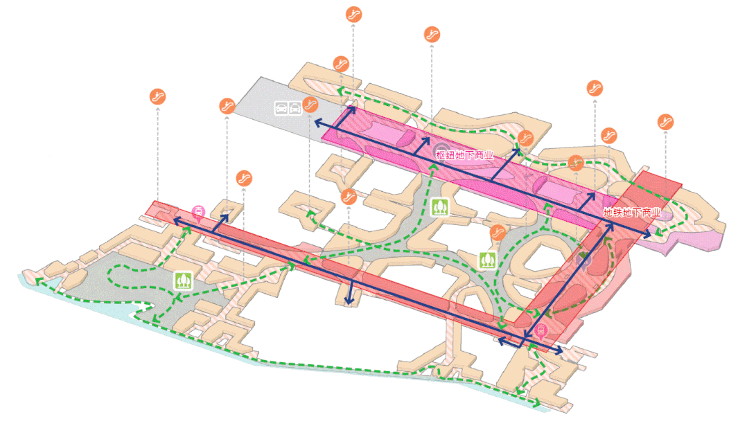 面对位于地下的各轨道交通,设计充分利用这一特质,将与地下的轨道交通设施距离最近的地下一层作为城市连接框架。在轨道站点之间,通过“U”型室内步行街道结合放射式次通道,构建24小时全天候城市通廊,高效直达各个枢纽的同时,串联多个特色空间节点。