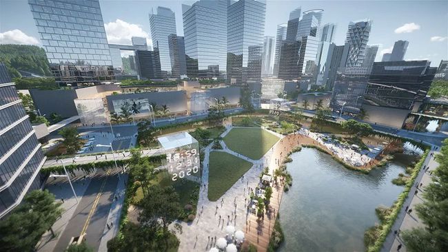据了解,此设计从片区自然环境中汲取灵感,将自然与水融入高密度的城市,构建清水河独特的片区名片。