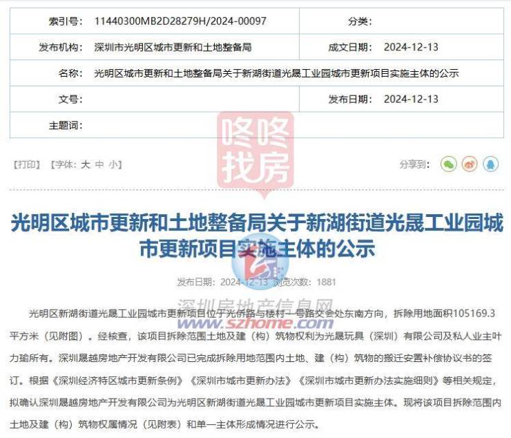 去年12月,已经确定越秀(深圳晟越房地产开发有限公司)为光晟工业园城市更新项目实施主体。
