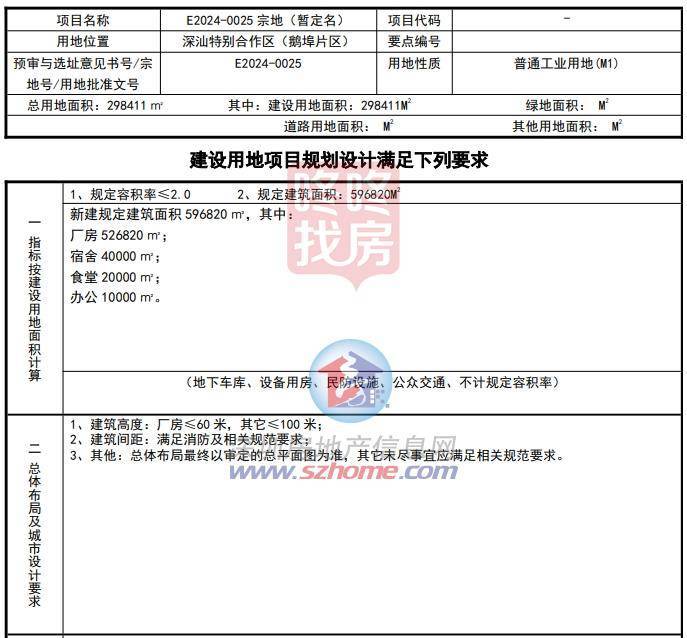 规划设计要点显示,新建规定建筑面积596820平方米,其中:厂房526820平方米,宿舍40000平方米,食堂20000平方米,办公10000平方米。