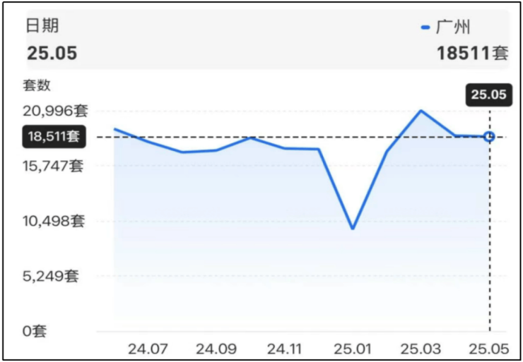从上表来看,去年底到现在,正是新一代、高端改善型产品大规模上市阶段。同期,二手住房挂牌量也在快速上升。经历了2022-2024年连续三年的快速去化,依然没有阻挡住挂牌的热情。今年一季度,广州单月二手房挂牌增量一度超过2万套,5月份有所下行但依然超过去年下半年。