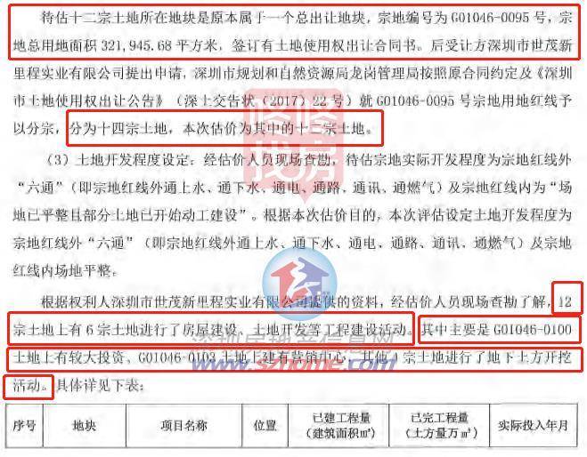从公布的评估报告显示,这次法拍的12宗土地出自2017年239亿拿下的龙岗G01046-0095商业用地,总用地面积有321945.68平方米。该地被分为14宗地,此次法拍的为其中的12宗地。