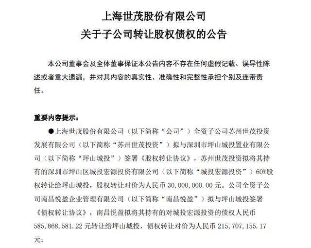 今年3月,据世茂集团公告,苏州世茂拟与坪山城投签署股权转让协议;苏州世茂拟将其持有的城投宏源60%股权转让给坪山城投。