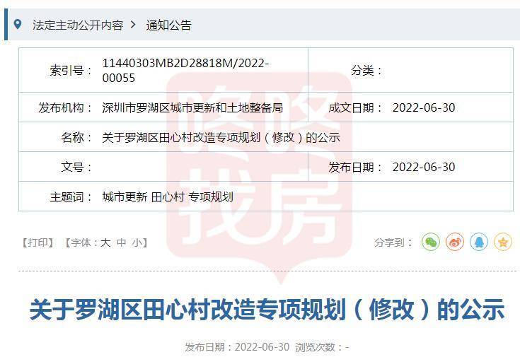 罗湖区城市更新和土地整备局发布《关于罗湖区田心村改造专项规划(修改)的公示》。