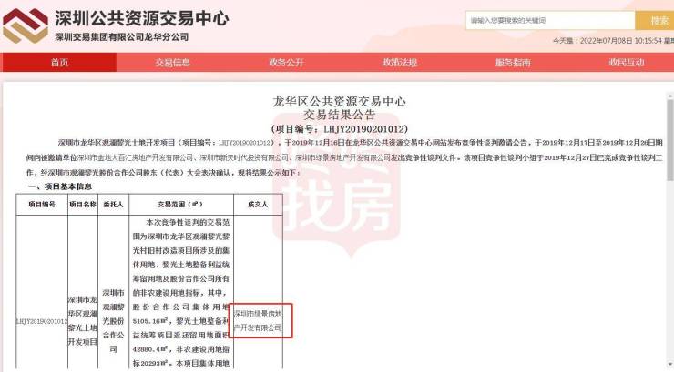 早在2020年,深圳市龙华区公共资源交易中心发布公告显示,深圳市龙华区观澜黎光土地开发项目,交易范围为深圳市龙华区观澜黎光黎光村旧村改造项目所涉及的集体用地、黎光土地整备利益统筹留用地及股份合作公司所有的非农建设用地指标,由绿景拿下。