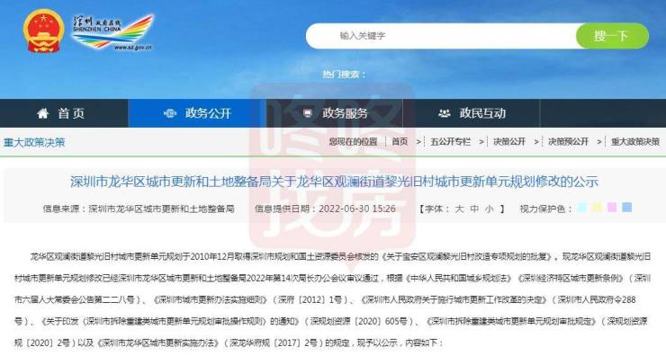 近日,深圳市龙华区城市更新和土地整备局发布《关于龙华区观澜街道黎光旧村城市更新单元规划修改的公示》。