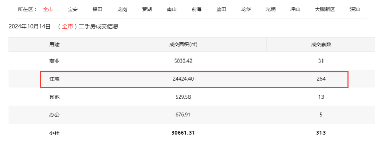 2024年10月14日二手房住宅网签264套。宝安29套;福田47套;龙岗68套;罗湖40套;南山34套;盐田9套;龙华21套;光明4套;坪山6套;大鹏6套。