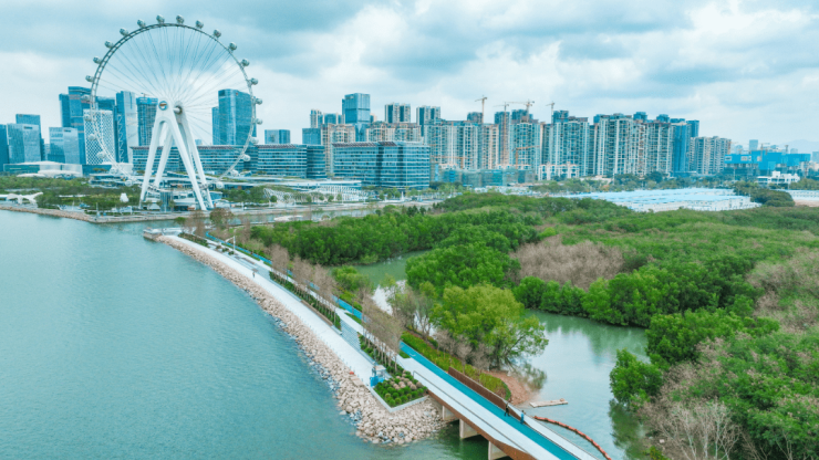 西部海岸活力带宝安示范段以滨海、生态、自然教育体验为主题,旨在打造成为国际化高标准的活力岸线,沿途更是贴心地设置了11组休憩坐凳、1座公共服务卫生间、喷淋雾森系统及景观照明等设施,满足市民服务便捷、出行舒适的功能需求。项目建设规划主要分为四大区域:驳岸绿带区,为新圳河岸新添休闲绿道,是摩天轮最佳观赏点;弹性海绵区,在调蓄防洪基础上,构建弹性海绵自然草甸;亲水海堤区,结合海岸潮汐特色,塑造城市名牌互动景观;红树森林区,全面保护修复红树林湿地生态,营建水生环境,与山、海、河、城开放共融。