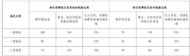 针对不同改造类型(如城中村改造、旧工业区等)在基准比例基础上有核增或核减情况。例如城中村改造移交保障性住房用地时配建比例核减10%,旧工业区等改造在移交保障性住房用地时配建比例核增15%等;在移交保障性住房时也有相应的核减情况。