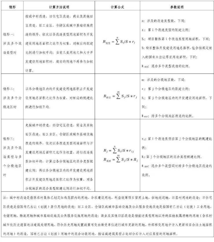 7、加权平均计算方法:城市更新单元拆除范围涉及多个改造类型或多个分类地区的,配建比例根据下表明确的方法加权平均确定。