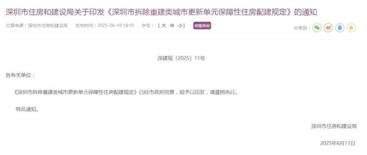 6月19日,深圳住建局正式印发《深圳市拆除重建类城市更新单元保障性住房配建规定》。