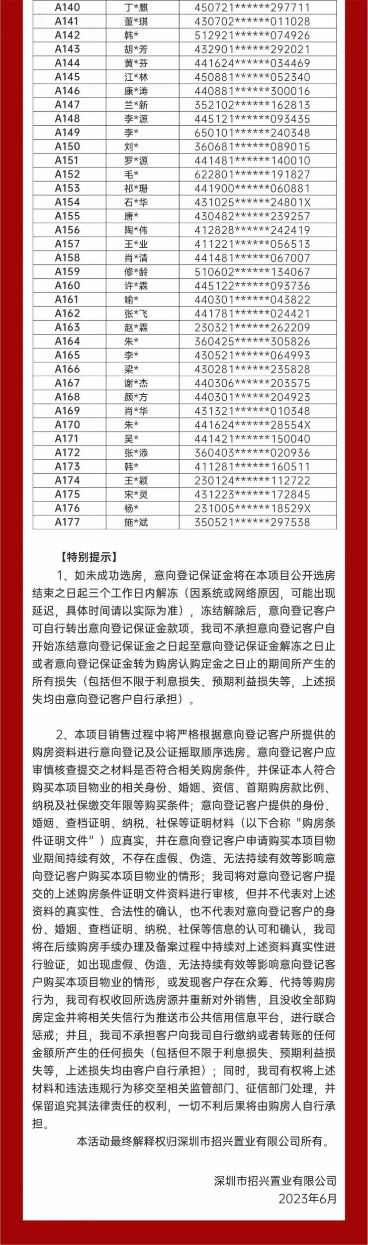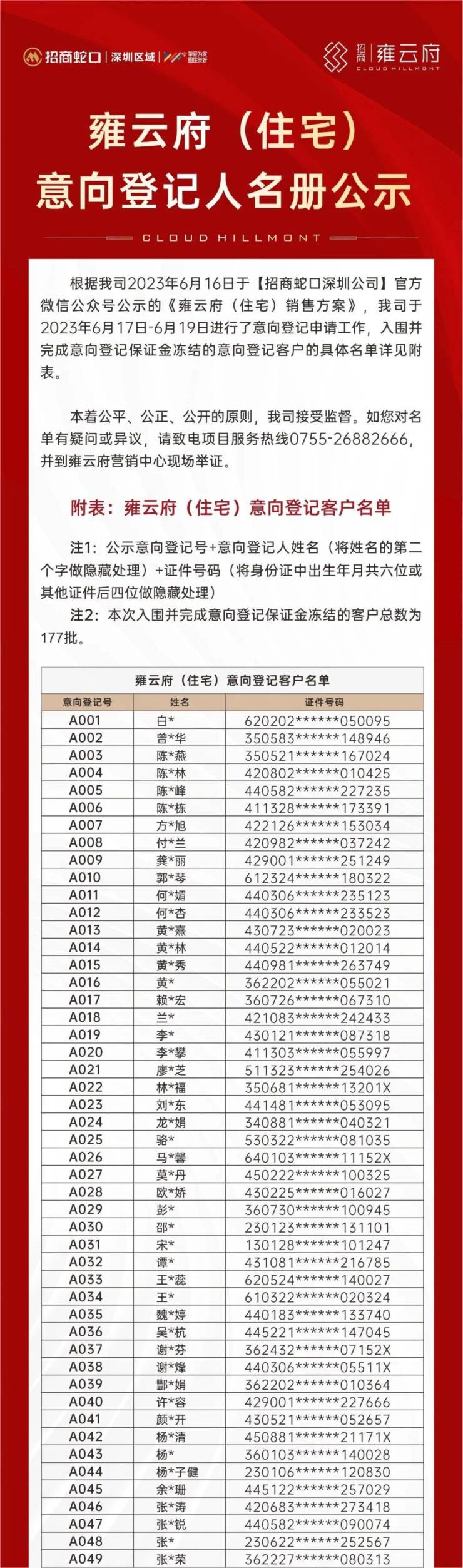 6月20日,招商雍云府登记人名册公示,此次共有177批客成功意向登记。
