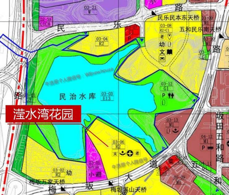 根据法定图则所示,项目东侧还规划有小学用地,但地块部分区域被挪建为华景乐园项目;环民治水库北侧的03-04地块规划为二类居住用地、03-07地块规划为商业用地。