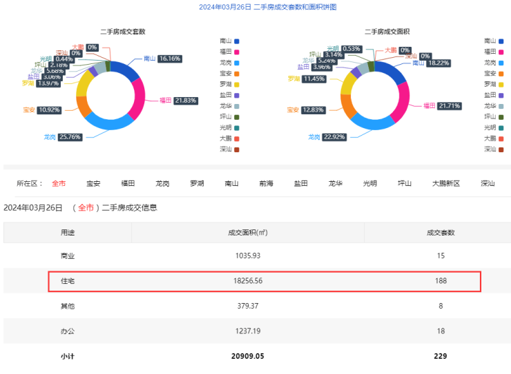 2024年3月26日二手房住宅网签188套。宝安22套;福田28套;龙岗54套;罗湖28套;南山32套;盐田6套;龙华12套;光明1套;坪山5套;大鹏0套。