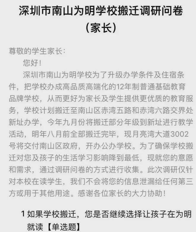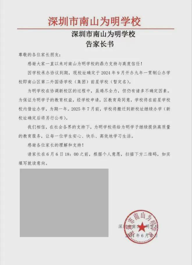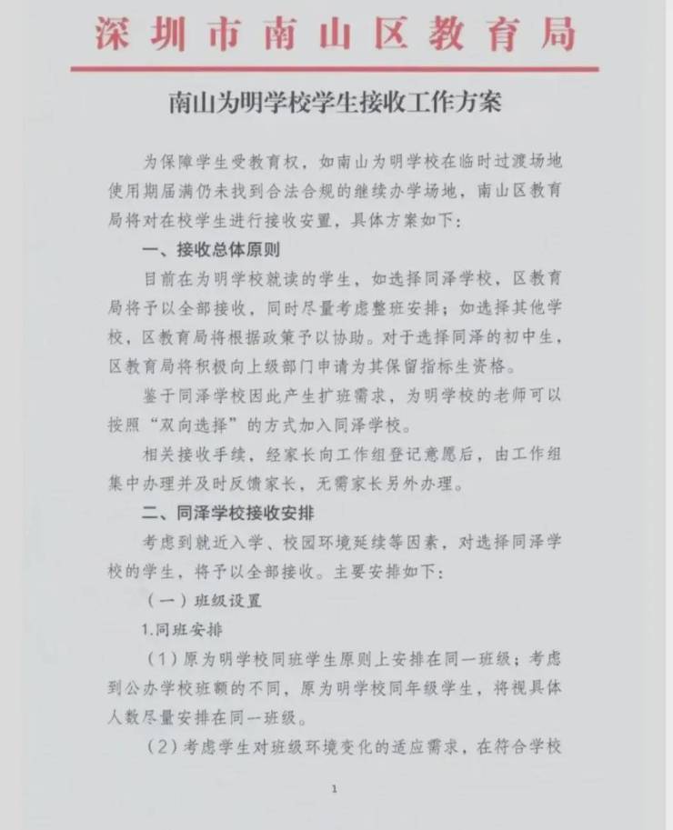 据南山相关部门发布的《南山为明学校学生接收工作方案》显示,南山为明学校在临时过渡场地使用期届满仍未找到合法合规的继续办学场地,对在校学生进行接收安置。