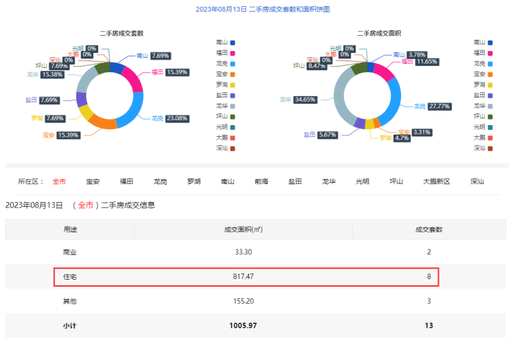 8月13日二手房住宅网签8套。宝安0套;福田0套;龙岗3套;罗湖1套;南山0套;盐田1套;龙华2套;光明0套;坪山1套;大鹏0套。