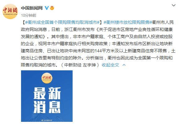 分析指出,衢州也因此成为全国排名前列个限购和限售均取消的城市,具有非常强的信号意义。