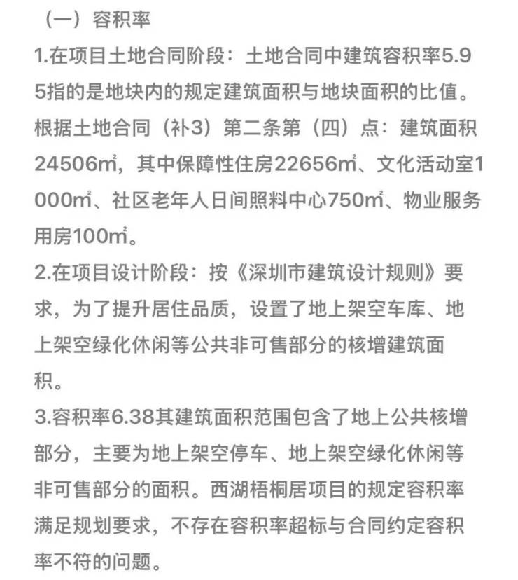 容积率6.38其建筑面积范围包含了地上公共核增部分,主要为地上架空停车、地上架空绿化休闲等非可售部分的面积。西湖梧桐居项目的规定容积率满足规划要求,不存在容积率超标与合同约定容积率不符的问题。
