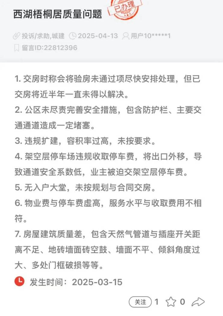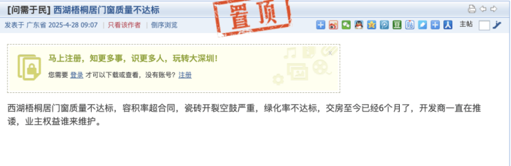 奥一新闻记者注意到,近日,有多位市民分别在人民网领导留言板、深圳论坛上发帖,称收房近半年的深圳市盐田区西湖梧桐居小区存在多个问题。主要包括: