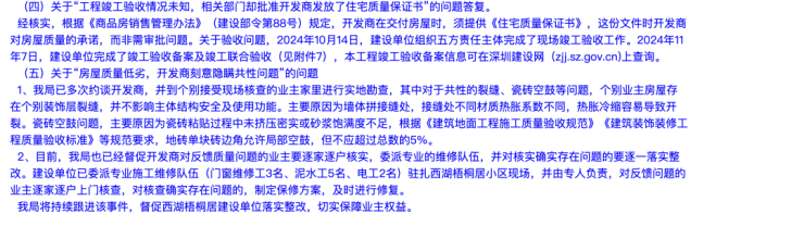 盐田住建局表示,已到个别接受现场核查的业主家里进行实地勘查,其中对于共性的裂缝、瓷砖空鼓等问题,个别业主房屋存在个别装饰层裂缝,并不影响主体结构安全及使用功能。主要原因为墙体拼接缝处,接缝处不同材质热胀系数不同,热胀冷缩容易导致开裂。瓷砖空鼓问题,主要原因为瓷砖粘贴过程中未挤压密实或砂浆饱满度不足。