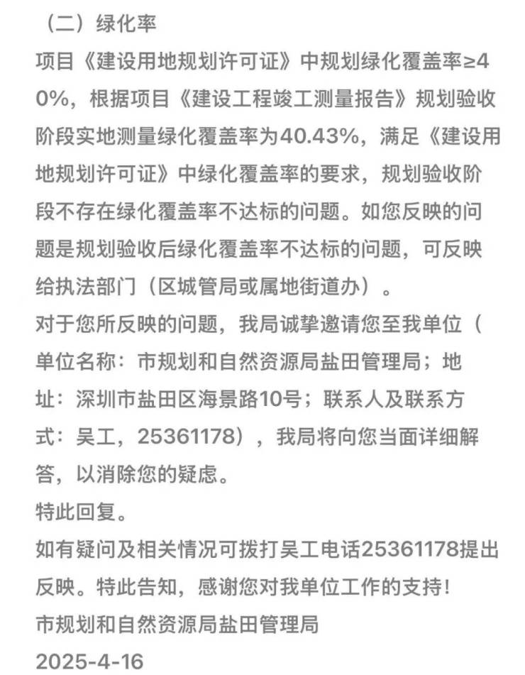 深圳市市场监督管理局盐田监管局对容积率、绿化率问题进行回复: