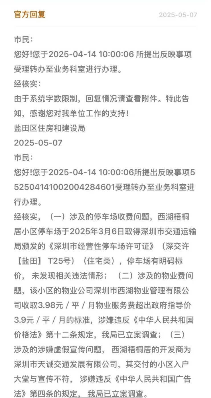 深圳市市场监督管理局盐田监管局针对该小区停车场收费、物业费收取、入户大堂涉嫌虚假宣传的问题进行回复: