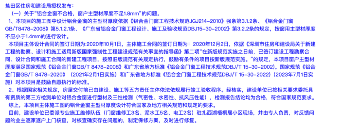 盐田区住建局针对铝合金窗不合格、燃气管道设计不合理、隔音差、房屋质量低劣等问题作出回复: