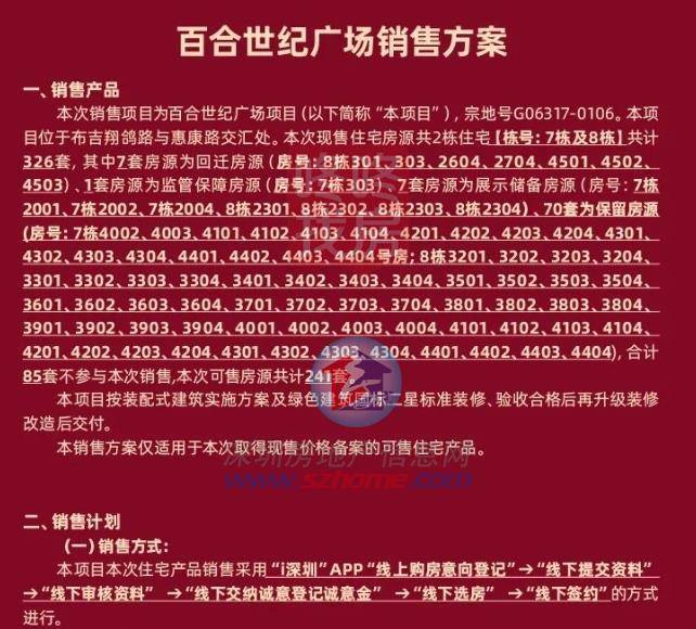 12月28日,百合世纪广场发布销售方案,方案显示85套房不参与此次销售,本次共有241套房可售,此批产品均为现售。
