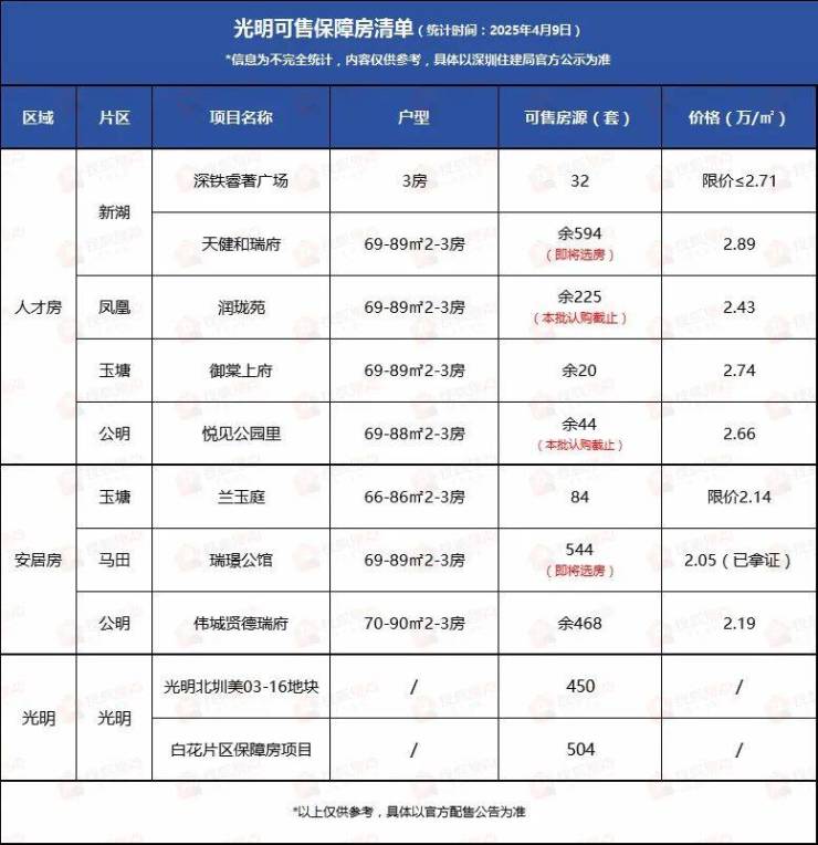 在表中统计到,全新待配售的人才房和安居房项目各还有一个,分别是深铁睿著广场有32套人才房,兰玉庭有84套安居房,两盘合计仅百余套,也预示着光明的人才房、安居房供应已经步入尾声。