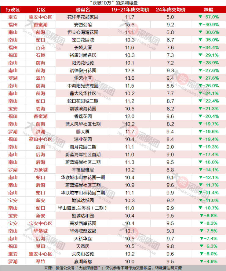 罗湖区跌幅最高的是翠竹的愉天小区,成交均价从13.0万元/㎡下跌至9.4万元/㎡。