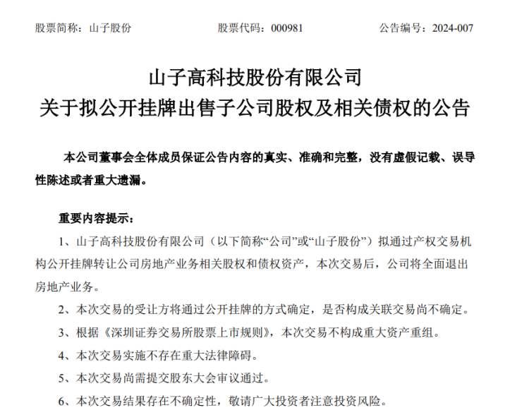 3月12日晚间,山子股份(SZ000981,股价1.46元,市值146亿元)公告称,拟公开挂牌转让公司房地产业务相关股权和债权资产。此次交易后,公司将全面退出房地产业务。