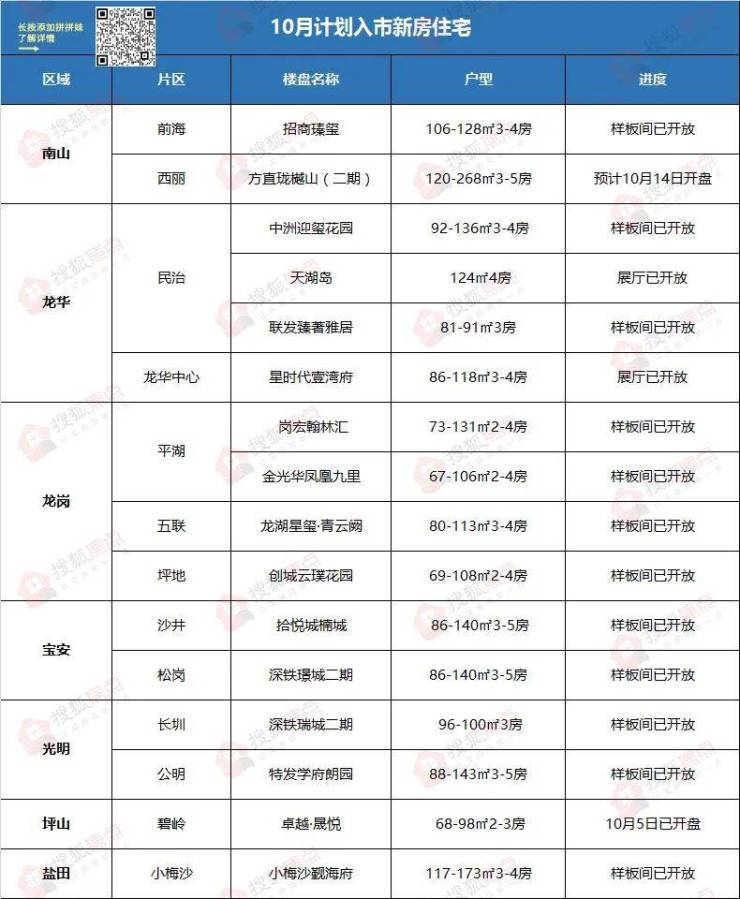 据统计,10月深圳新盘市场预计有16盘计划入市,其中主要分布在龙华、龙岗,此外,南山、宝安、光明也有多个新盘计划入市。