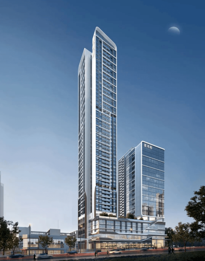 首推的是卓越蔚蓝星宸府,占地面积约1.8万㎡,总建筑面积约15.4万㎡,计容建筑面积约11.3万㎡,容积率6.25,绿化率35%,共由4栋46-50F住宅组成,商业面积4800㎡。总规划1253户,3梯7户设计,停车位1200个(占比约1:0.96)。