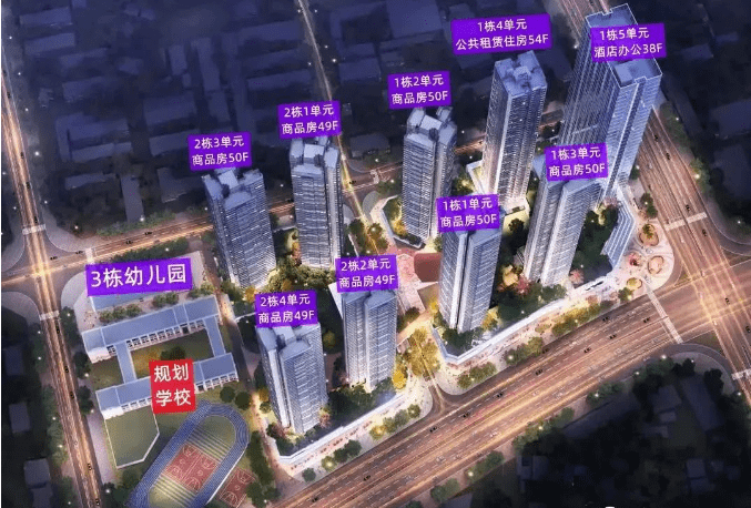 其中计容建筑面积约31万㎡,容积率8.2,绿化率40%,共由9栋超高层建筑组成,规划总户数2606户(其中商品房2212户,公共租赁住房394户),停车位1920个(车位比1:0.73)。