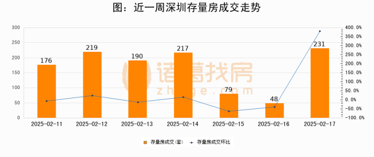 从存量房来看,2025年02月17日深圳存量房单日成交231套,比昨日增加183套,环比上涨381.2%。从近一周存量房成交来看,深圳存量房日均成交套数为165套,02月17日单日成交231套,高于近一周平均水平40%。