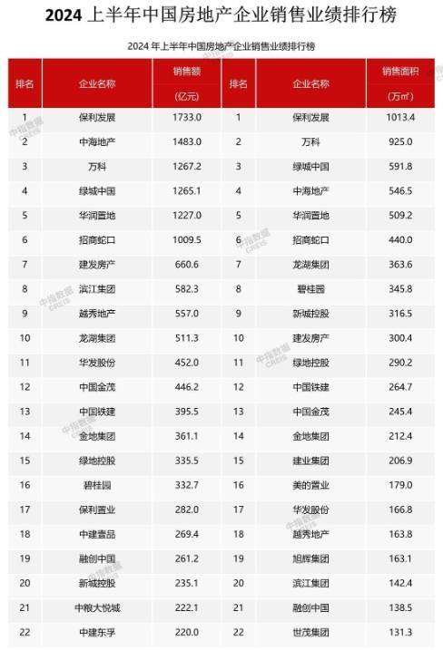 数据显示,保利发展、中海地产、万科位居上半年销售额前三名,销售额均超过千亿元。