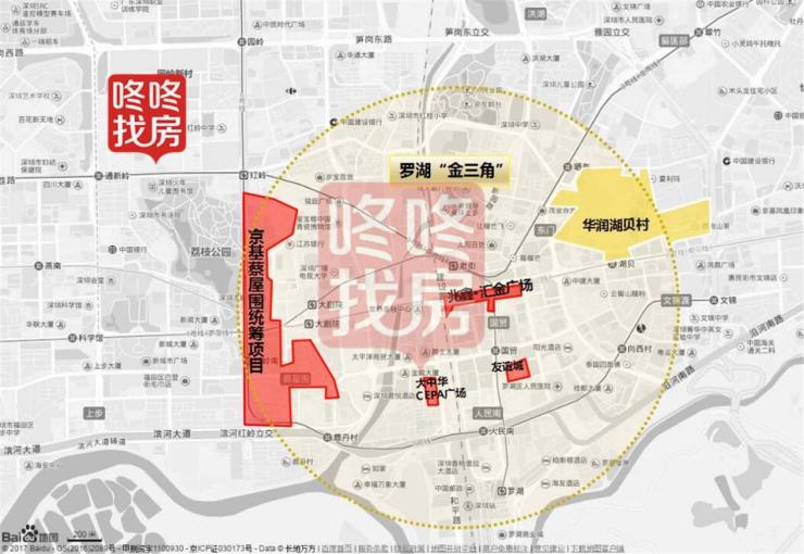 项目位于深南大道与人民南路、建设路交汇处,周边集中式购物中心和大厦集聚,比如地王大厦、万象城、金光华广场和茂业百货等,区域内商业繁荣,人气较旺;是罗湖非常重要的“金三角”商圈,也是深圳较大规模的商圈。万象城的年度营业额近几年一直超越深圳各大购物中心位居榜首,而金光华广场也能排到前五的位置。下图可直观表示项目处于金三角的位置。