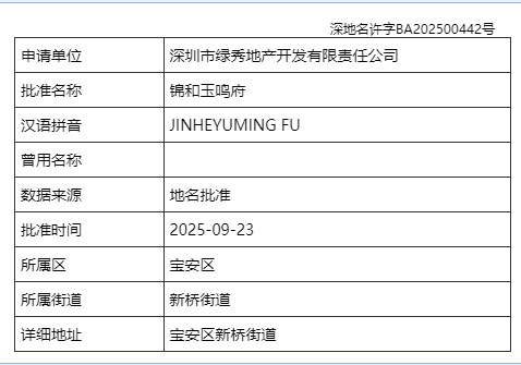 据深圳市地名一张图显示,绿城新桥的A319-1225宗地命名为锦和玉鸣府。