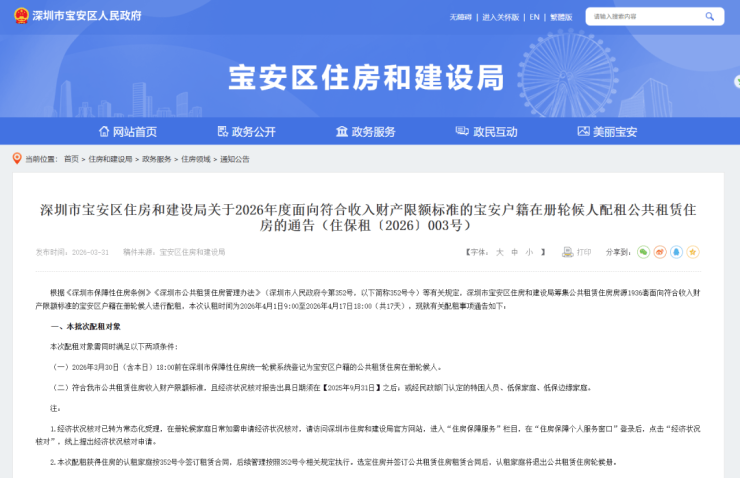 3月31日,宝安区住建发布关于2026年度面向符合收入财产限额标准的宝安户籍在册轮候人配租公共租赁住房的通告(住保租〔2026〕003号)。