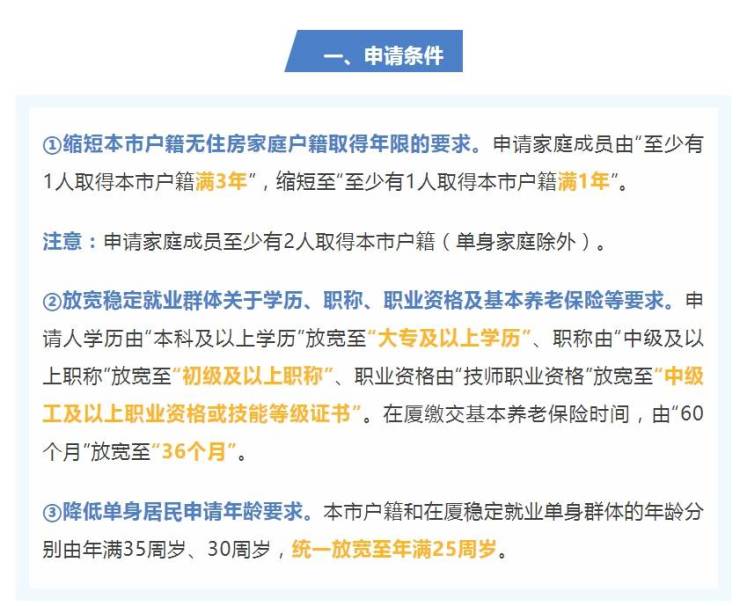 降低单身居民申请年龄要求。本市户籍和在厦稳定就业单身群体的年龄分别由年满35、30周岁,统一放宽至年满25周岁。