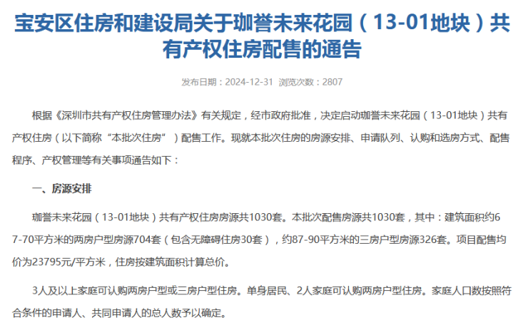 12月31日,宝安住建局发布珈誉未来花园共有产权住房配售的通告,本批配售房源共1030套,其中:建筑面积约67-70㎡的两房户型房源,704套(包含无障碍住房30套),约87-90㎡的三房户型房源326套。项目配售均价为23795元/㎡。
