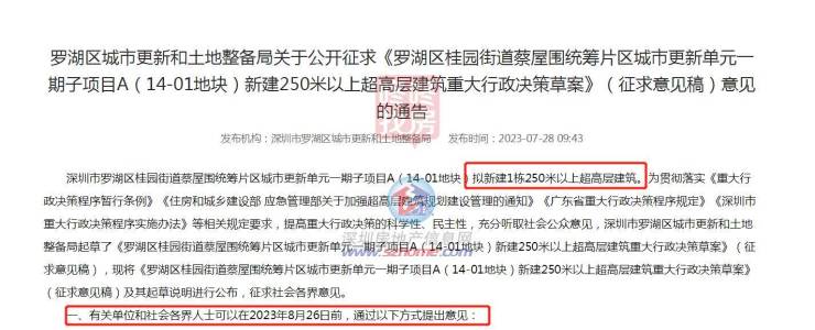 蔡屋围项目片区一期子项目A(14-01地块)拟新建250米以上超高层建筑,目前重大行政决策草案(征求意见稿)正对外征求意见,此次意见征集至2023年8月26日前。